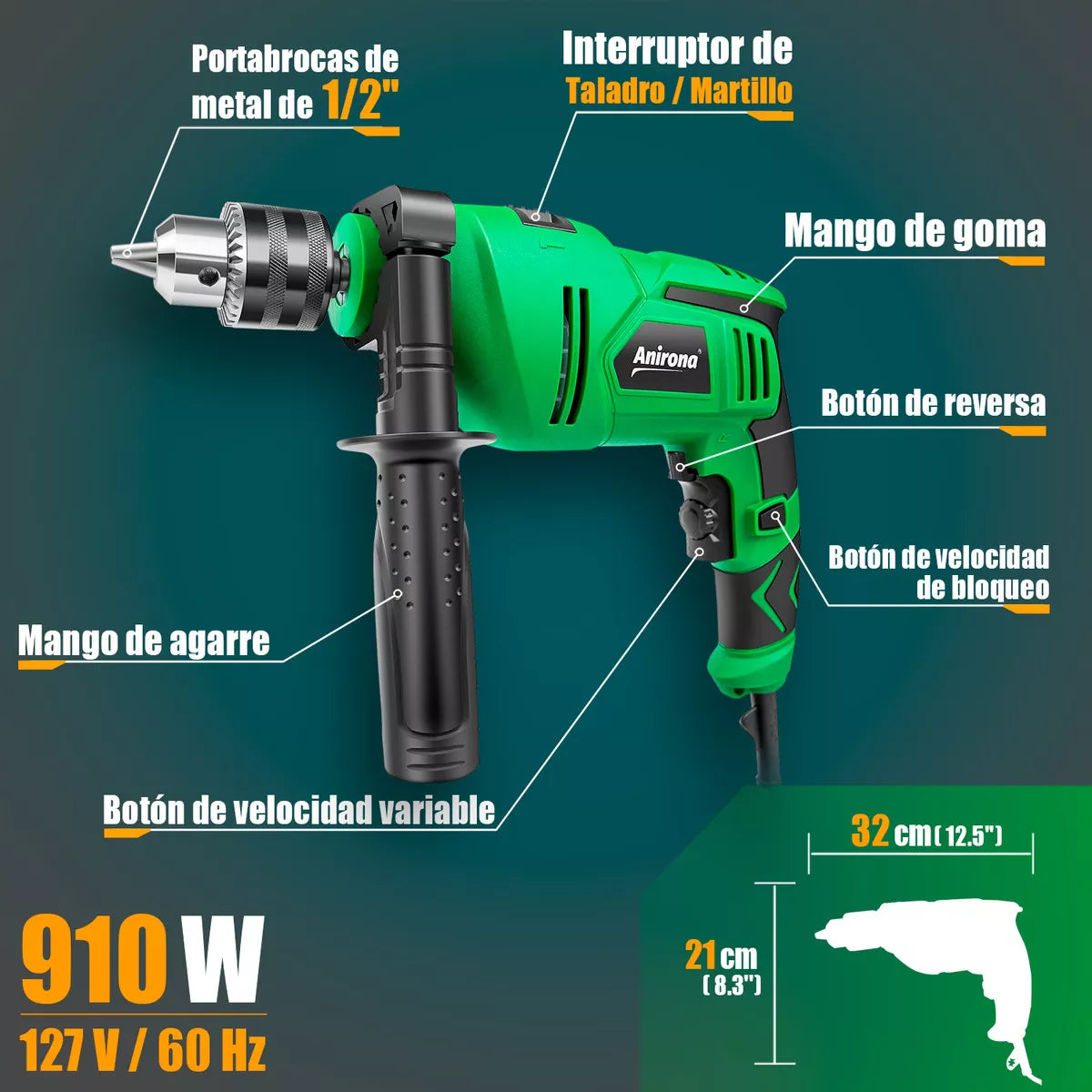Taladro Rotomartillo Anirona 1/2 Pro 910w C/brocas Y Puntas