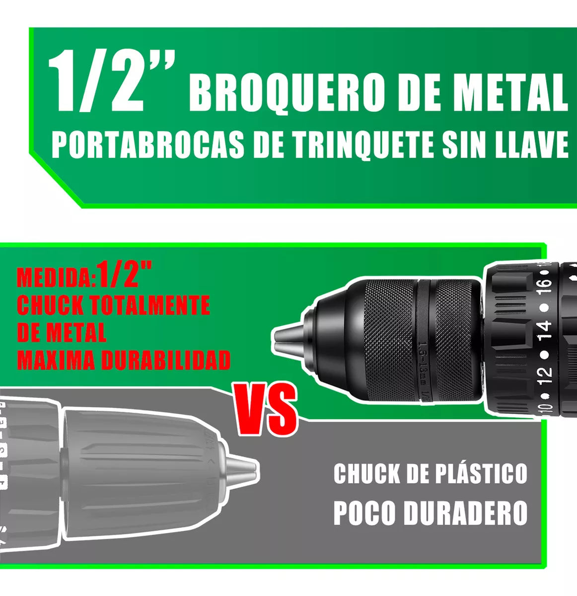 - Rango de sujeción de portabrocas: 1/2In (13 mm) máx.