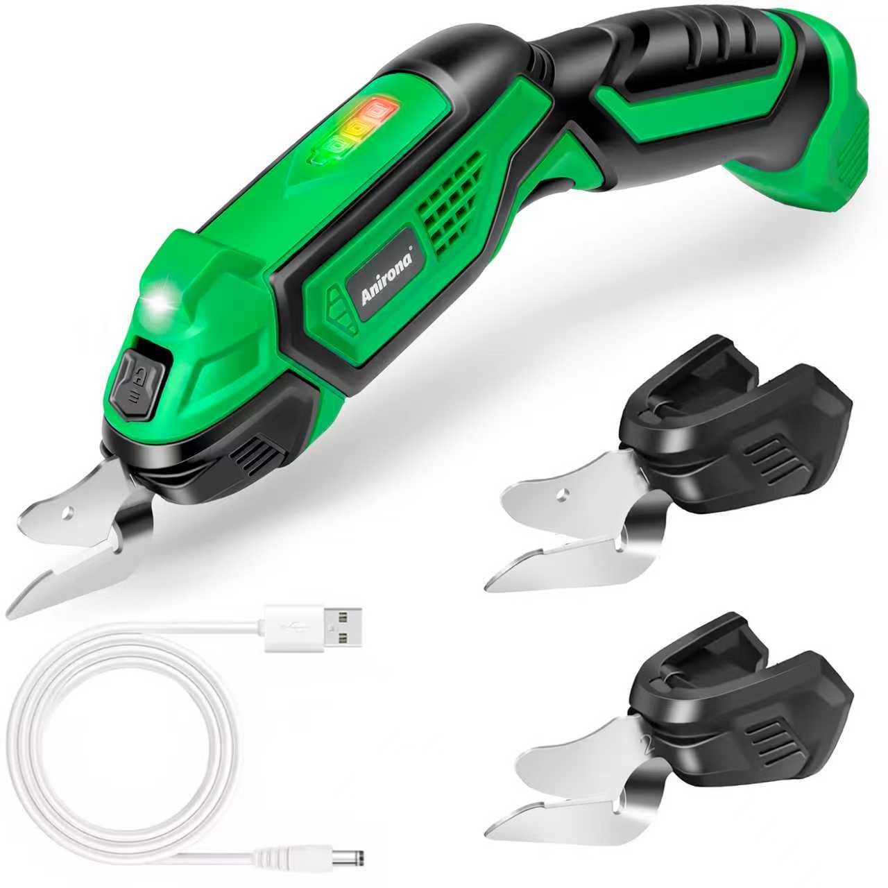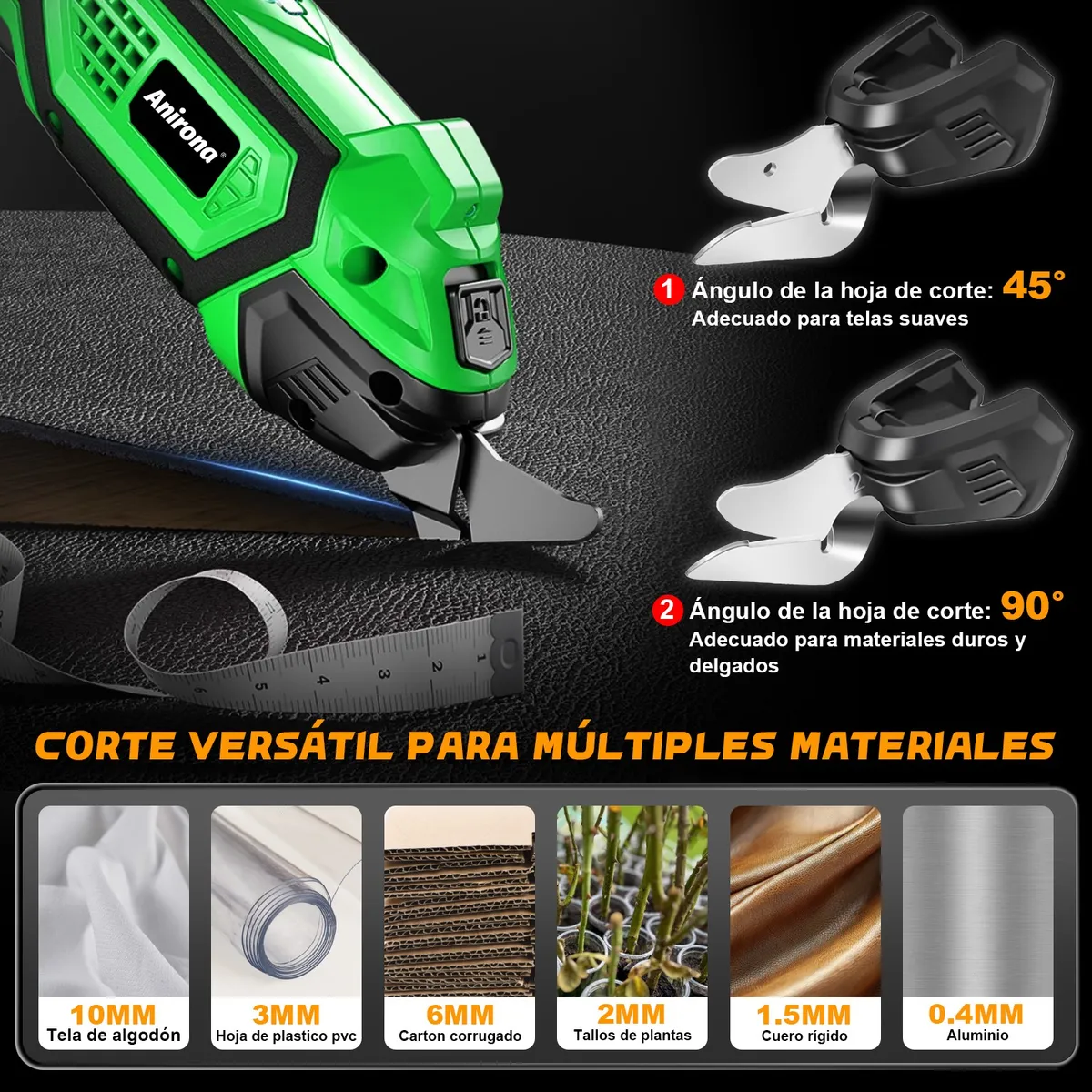 Las tijeras eléctricas Anirona ofrecen cortes suaves y rápidos con una capacidad de hasta 10 mm, ideales para cortar materiales como tela, cuero, papel, cartón, plástico e incluso lámina de aluminio.