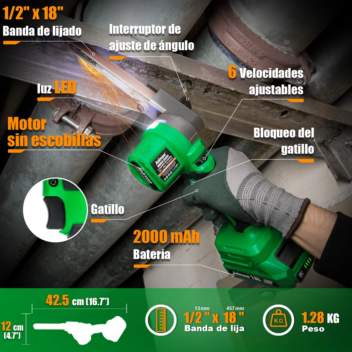 Mini Lijadora De Banda Sin Carbón 1/2 x 18 (13 x 457 mm) Anirona 2 Baterías 2000mAh