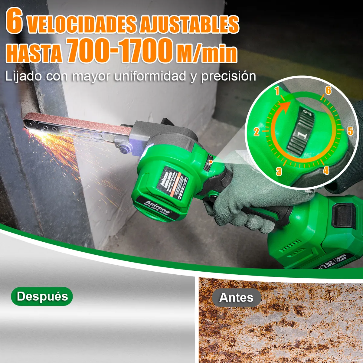 Velocidad ajustable en seis niveles: Permite adaptar la rotación según el material y la tarea, ofreciendo mayor control durante el lijado. La banda alcanza hasta 1700 m/min, garantizando un lijado potente, estable y de alta precisión en diversas aplicaciones.